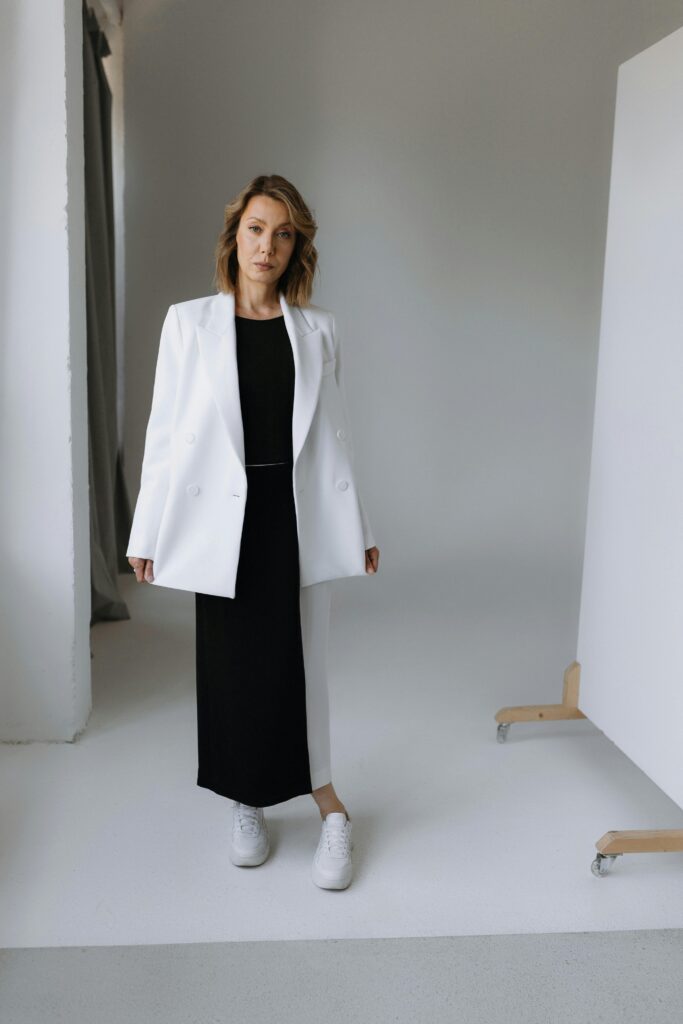Не менее важно и сочетание одежды. Если встреча проходит в ресторане со строгим дресс-кодом, лучше выбрать классический костюм или платье в паре с минималистичными кожаными кроссовками. В более демократичных заведениях допускается мягкий смарт-кэжуал: широкие брюки, струящаяся рубашка, жакет прямого кроя. Кроссовки в таком случае не нарушают баланс, а становятся элементом современного делового стиля.