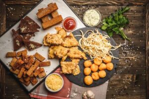 До пива пропонують аперитив, закуски, кесадилью, салати, тарілки, крильця, основні страви та інші смаколики.