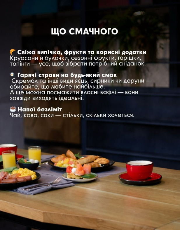 Выбирай фрукты, орешки, йогурт. Хочется более насыщенного завтрака? Скрембл, деруны, сырники – идеальная компания.