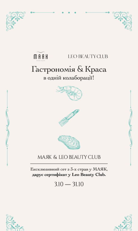 с 3 по 31 октября, заказывая эксклюзивный сет из трех блюд в Маяк, Вы получаете подарок и сертификат на скидку в Leo Beauty Club.