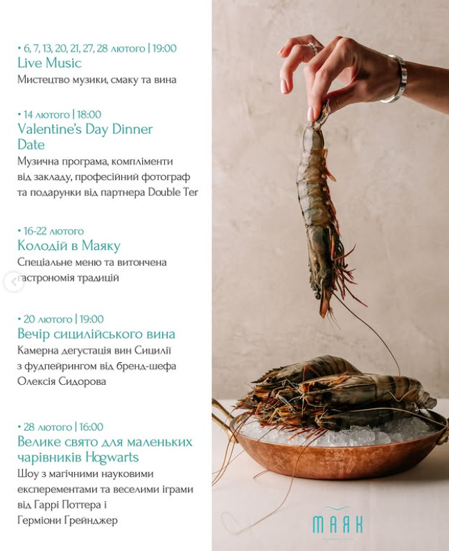 Романтический ужин для влюбленных, теплый Колодий с авторским вкусом, камерный сицилийский винный вечер и финал месяца в формате большого детского праздника с магией и смехом.
