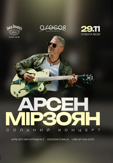 Билеты: https://kontramarka.ua/ru/arsen-mirzoan-97036.html Событийный партнер — Jack Daniel’s На территории резиденции предусмотрены укрытие и мощный генератор.