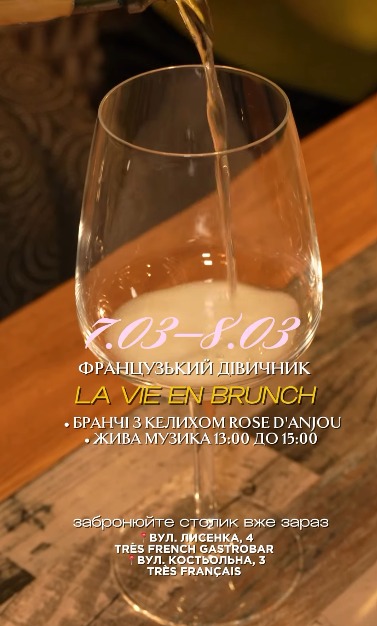 Живая музыка с 13:00 до 15:00 – только на локации Très Français (ул. Костельная, 3). +380 93 141 49 14