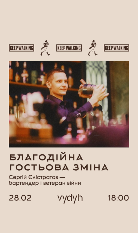 Сережа – пилот БПЛА, ветеран войны и несгибаемый человек в наших глазах, а еще – кайфовый бартендер, который станет в этот день за наш бар, чтобы собрать средства на имплантацию коленного сустава для побратима.
