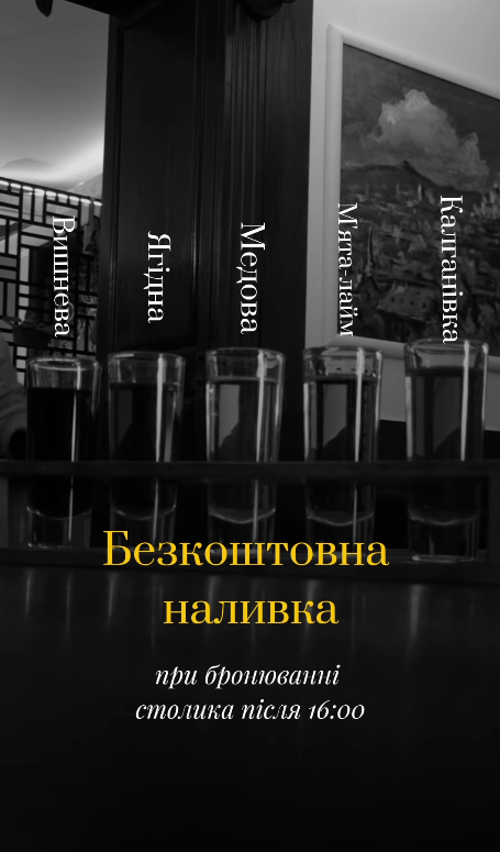 После 16:00 бронируй столик, заказывай от 600 грн – и забирай бесплатную порцию нашей фирменной наливки от заведения.