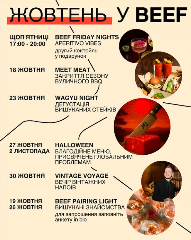 19 і 26 жовтня — BEEF PAIRING Light | вишукані знайомства з ідеальним поєднанням закусок та напоїв. Відбуваються лише за запрошенням.