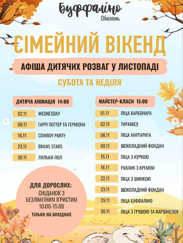 Плануємо сімейні вихідні в Буффаліно. Для малечі щовихідних проходять кулінарні майстер-класи та розваги з аніматорами, а для дорослих — сніданки з безлімітним ігристим та неперевершена італійська кухня.
