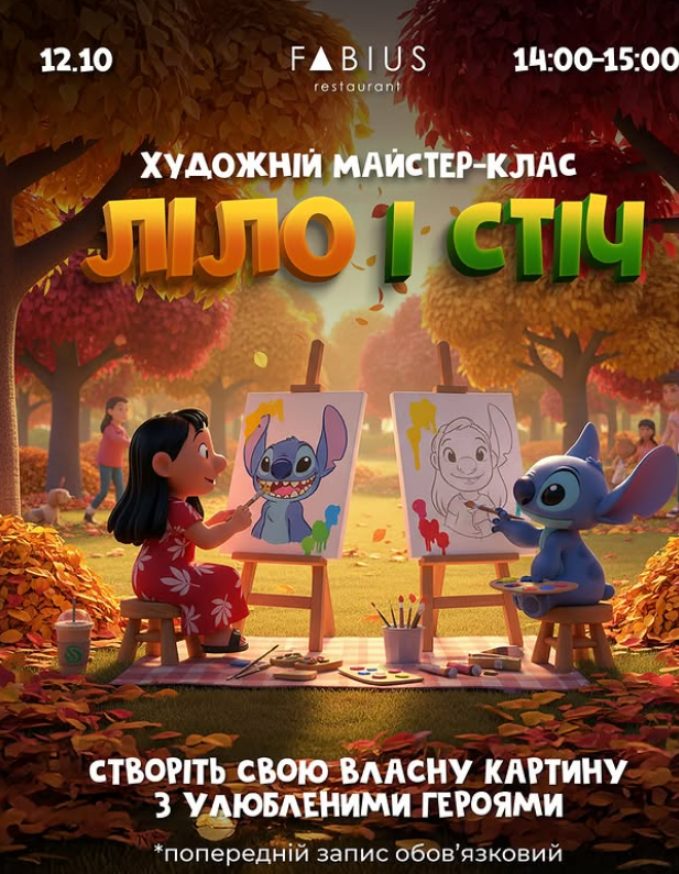 О 14:00 розпочнеться художній майстер-клас — малюємо картину з улюбленими героями Ліло і Стіч. (попередній запис обовʼязковий)