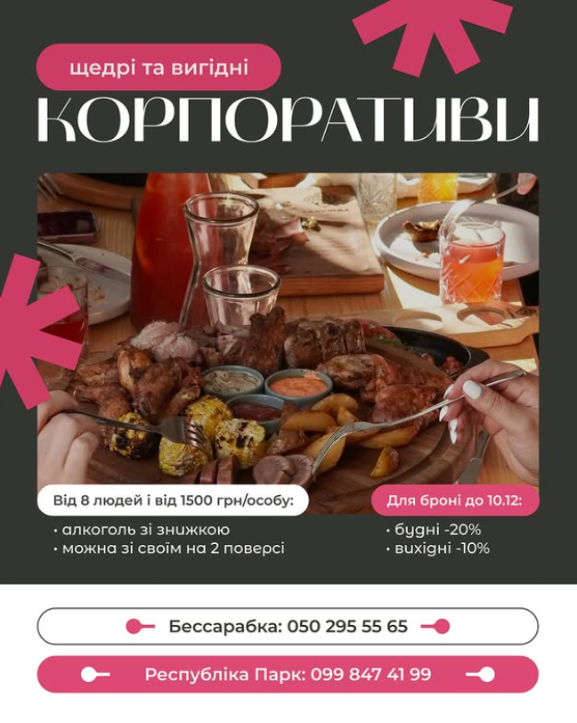 Окремий банкетний зал, свої напої , новітня українська кухня, щедрі порції.