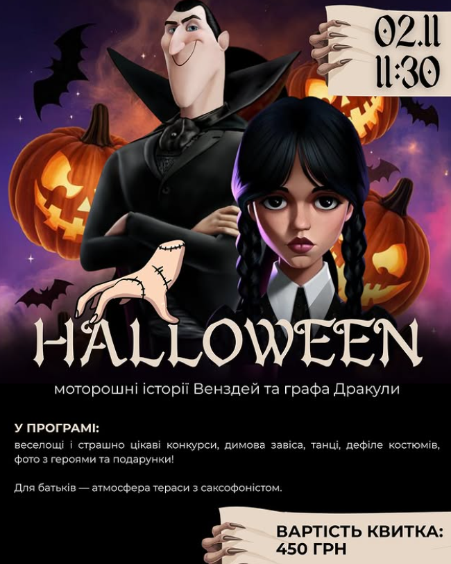 Наймолодших гостей чекає яскрава програма з улюбленими героями — Венздей і Дракулою .