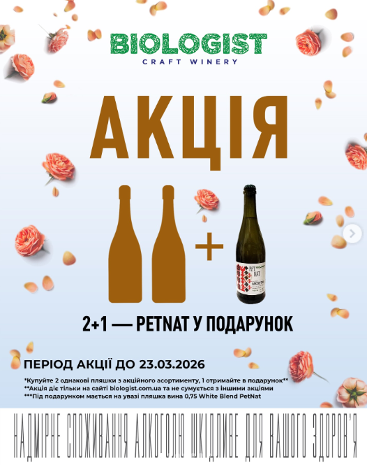 Обирайте дві однакові позиції з добірки на biologist.com.ua, вводьте промокод PETNAT — і PetNat White Blend додається до замовлення безкоштовно.