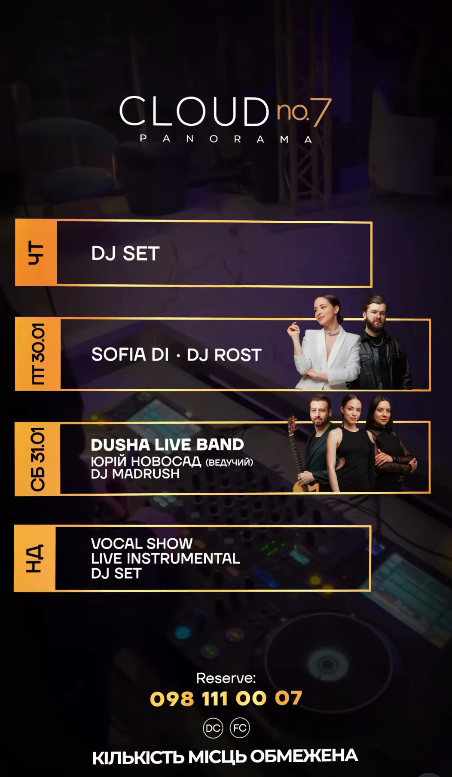 Львів / Календар подій / Ресторан CLOUD no.7 Panorama (Cloud Panorama) / Події / Вечори живої музики, емоцій та яскравої атмосфери .