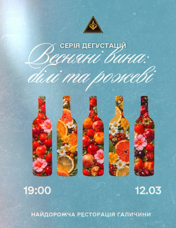 12 березня о 19:00 у Найдорожчій ресторації Галичини — дегустація «Весняні & фруктові вина» Вина, що говорять мовою квітів, ягід і сонця.